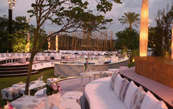 ![]() | ![]() The orchestra stand, bar and buffets were designed in soft, organic lines. The dance platform was positioned above the swimming pool and a small stream, lined with pebbles, gently flowed, outlining the setting and connecting the various areas. A conceptual separation between the reception area and the outer garden was created by a cluster of Bamboos. | ![]() |